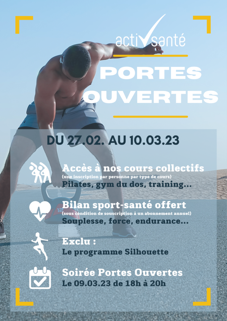 Nous sommes heureux de vous accueillir du 27 février au 10 mars 2023 dans notre centre de Physiothérapie, Bien-être, et de Forme & Sport pour nos PORTES OUVERTES !