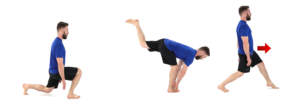 Amenez les deux mains au sol, en remontant, et étendez la hanche et le genou du pied d’appui en même temps que vous étendez la jambe libre en arrière.